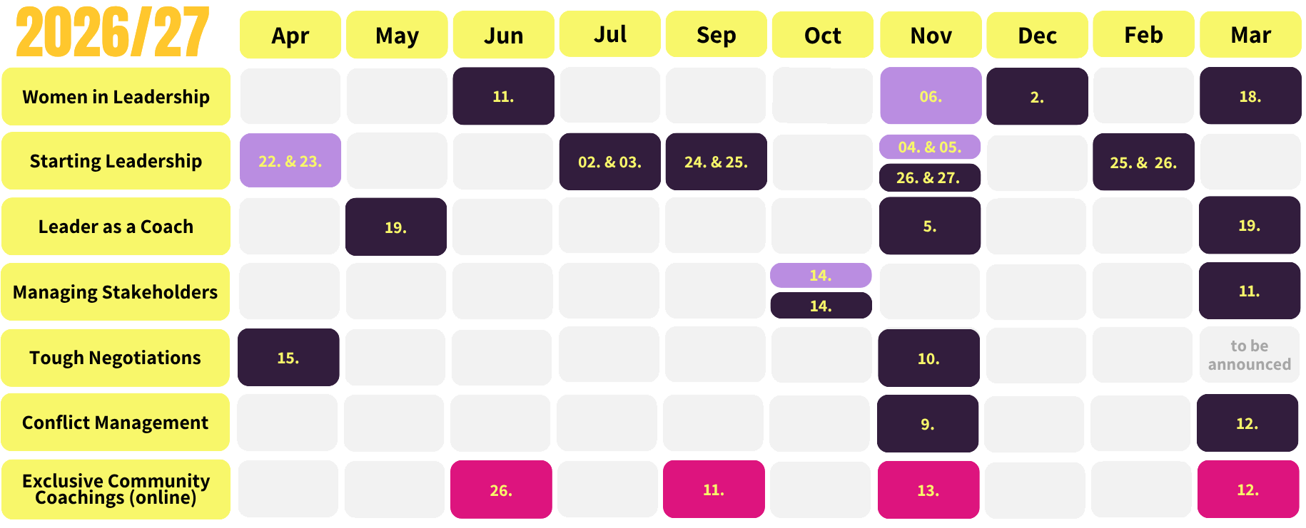 Schulungen: Starting Leadership, Frauen in Führungspositionen, Leader als Coach: